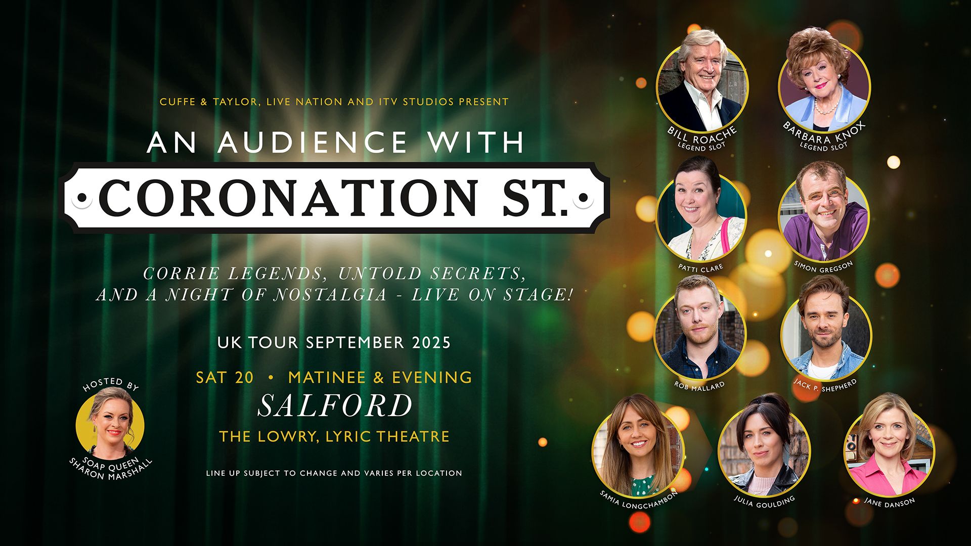 For the first time ever, the legendary stars of the world’s longest-running soap are stepping off the famous cobbles and onto the stage for an unforgettable evening! An Audience with Coronation Street is hitting the road, and it’s shaping up to be the must-see event of the year!