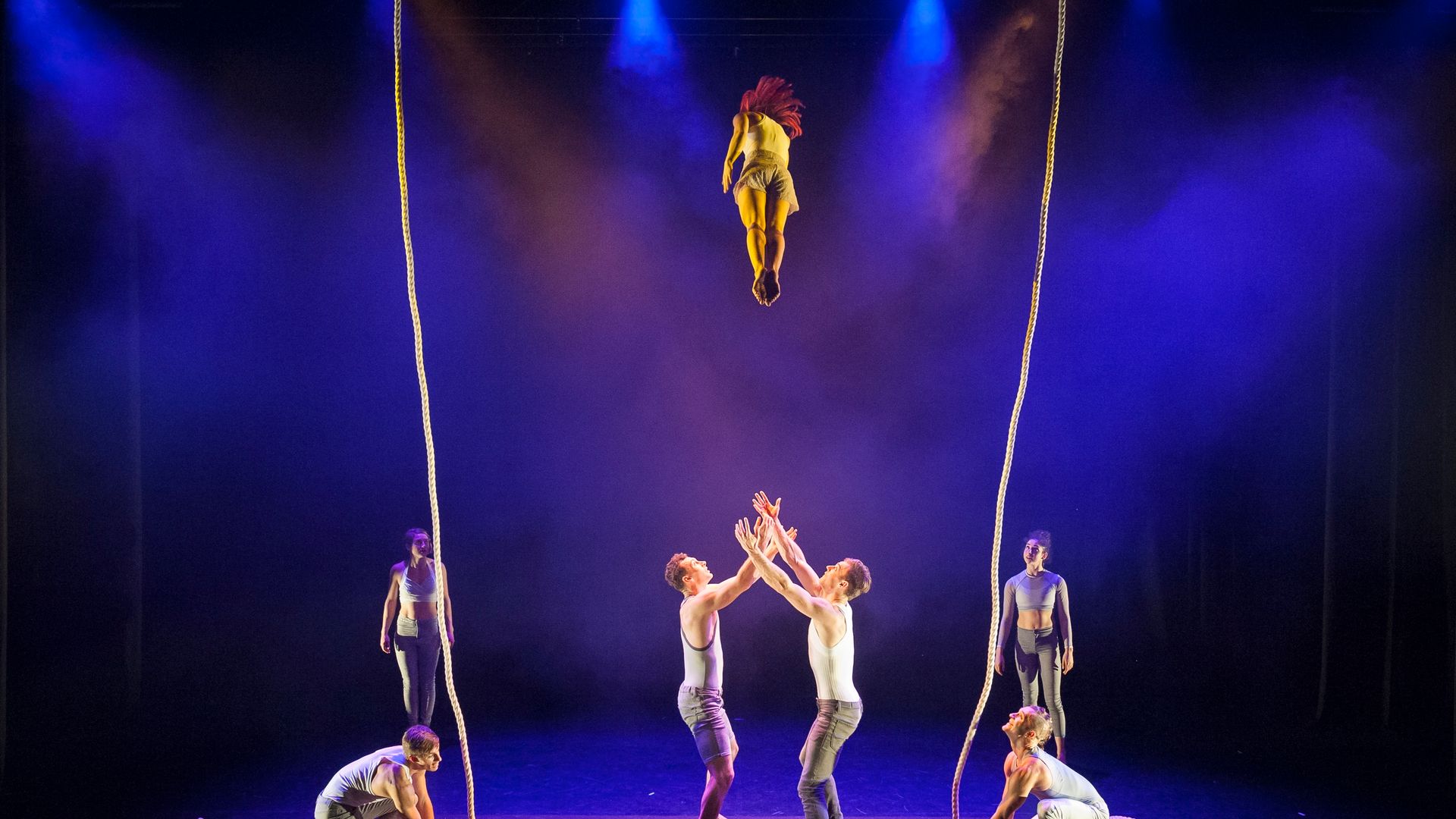 Long spools of white rope run through pulley sheaves and wrap around bodies, explicitly connecting the artists’ movements above and off the ground. The actions of one acrobat affect and implicate the movements of others in a mesmerising negotiation of cause and effect.